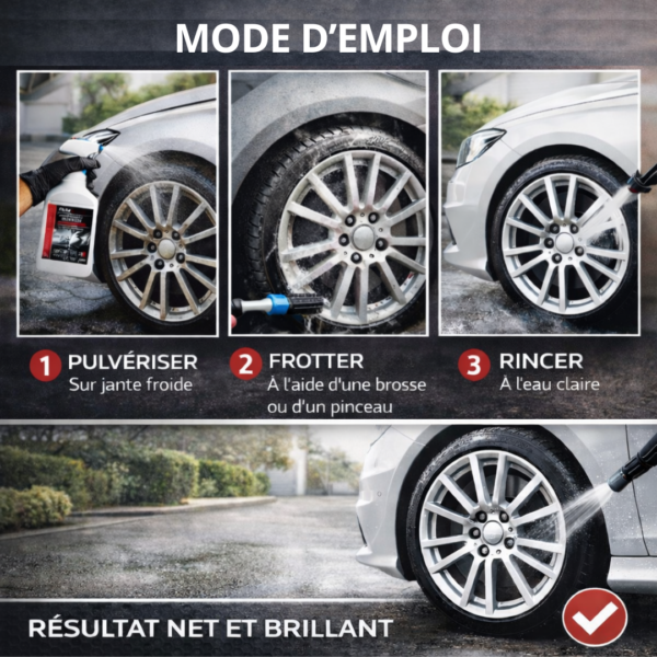 L’utilisation reste simple et accessible. Pulvérisez le produit sur une jante froide. Frottez si nécessaire à l’aide d’une brosse ou d’un pinceau. Rincez ensuite abondamment à l’eau claire. Cette méthode garantit un résultat propre et homogène, sans traces ni résidus.