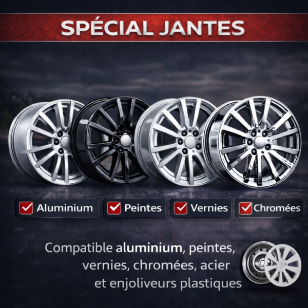 Ce nettoyant convient à la majorité des jantes du marché. Il s’utilise sur les jantes aluminium, peintes, vernies ou chromées. Il nettoie également les jantes acier ainsi que les enjoliveurs plastiques. Cette polyvalence permet de l’utiliser sur des véhicules récents comme plus anciens.